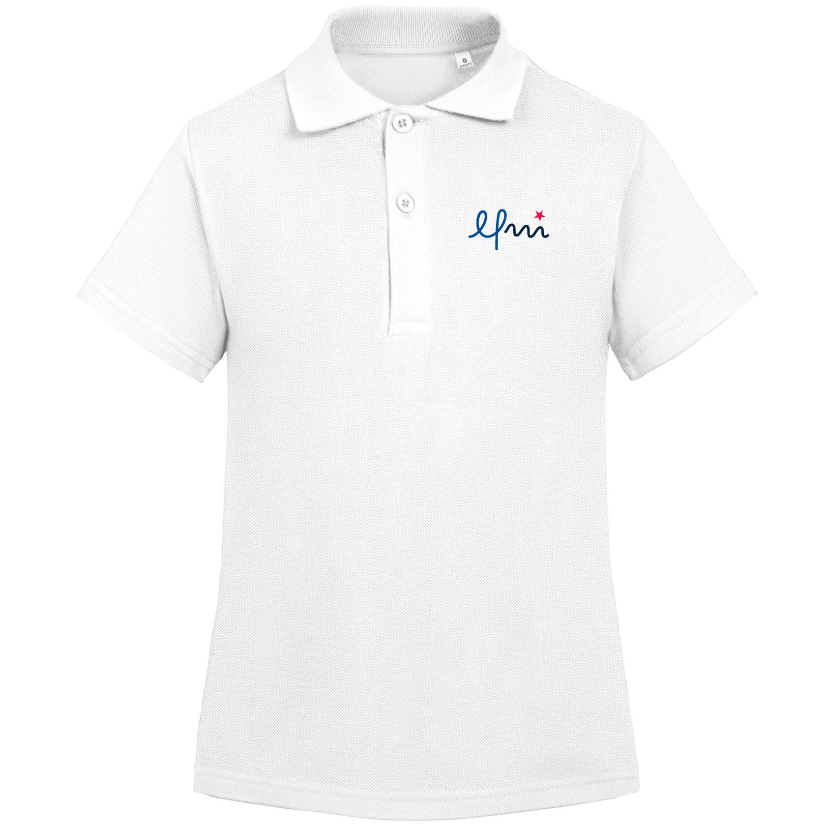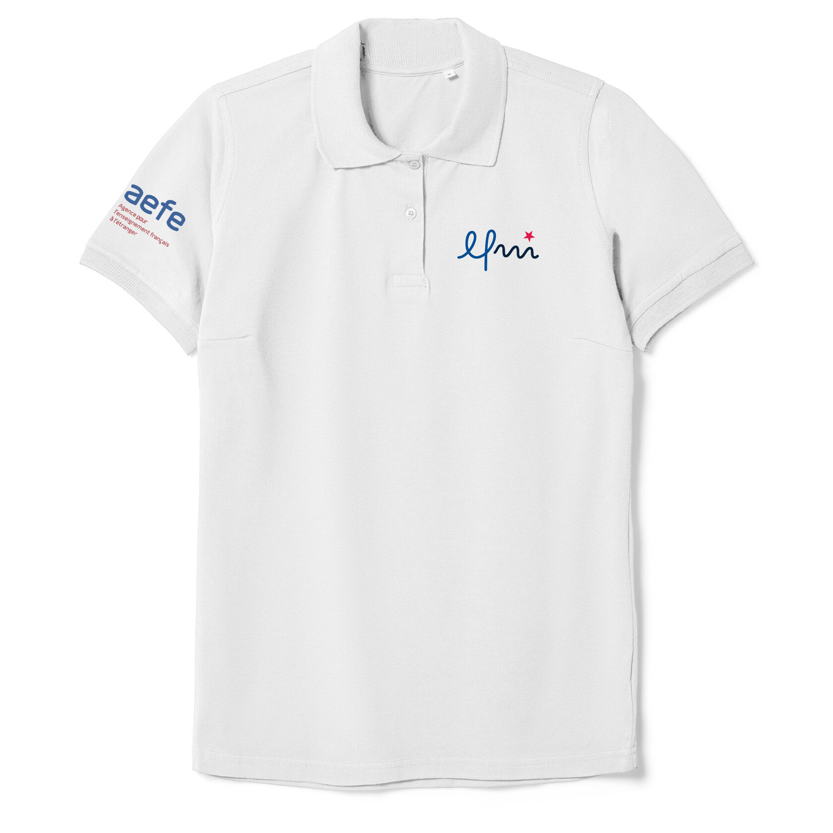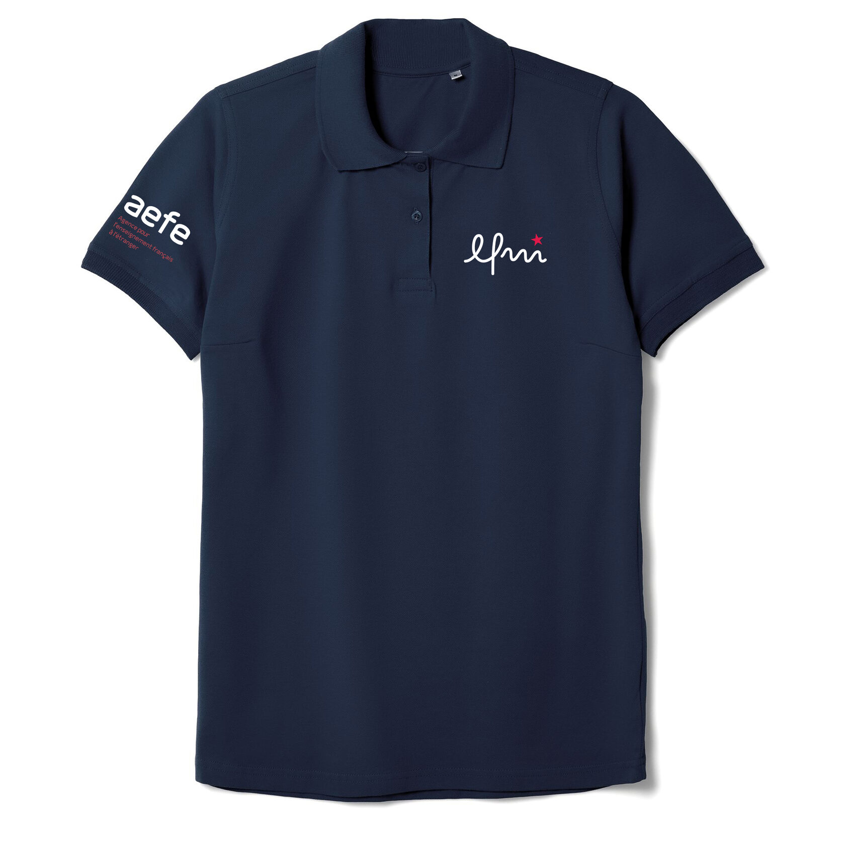 T-shirt polo coupe femme, blanc ou bleu foncé.